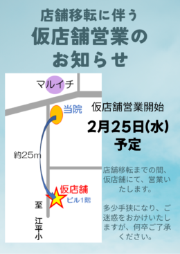 Acupunct Lab 片山治療院 > NEWS&TOPICS > 仮店舗営業予定について 仮店舗営業予定について 2026/01/17 店舗移転に伴い、仮店舗営業を予定しております。 下記案内を御覧ください。 « 年末年始の休院日について » ブログのトップへ戻る